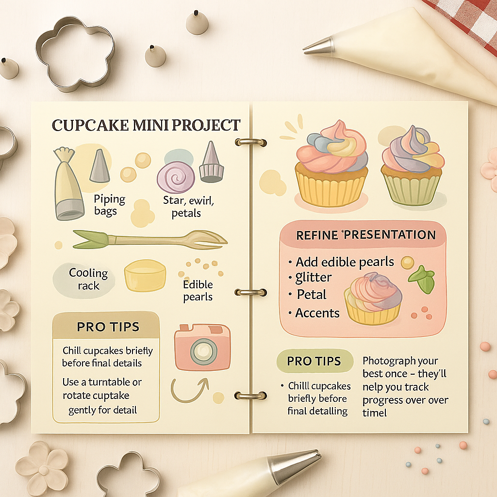 Master the key elements of cake decoration with Cake Decoration Guide Worksheets. These pages help you plan your designs, track progress, and refine your decorating style. From sponge preparation and frosting consistency to colour harmony and finishing details - you’ll have everything you need to stay consistent, avoid common mistakes, and create your most stunning cakes yet. It’s time to bake and decorate with confidence - the sweet and simple way.